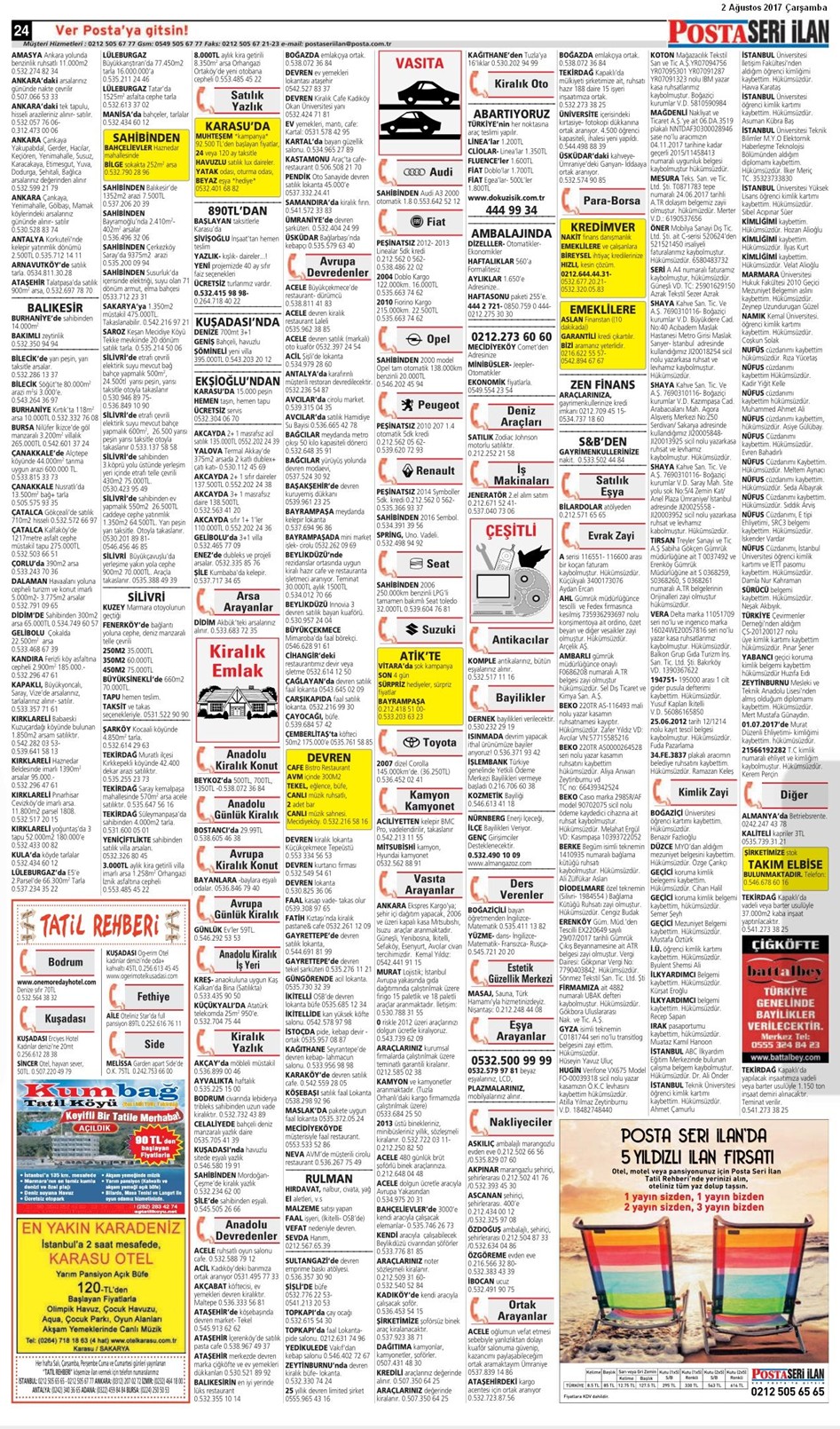 15 Ekim 2017 Posta İstanbul Seri İlan Sayfaları Posta İstanbul Seri İlan Sayfası 1 Posta İstanbul Seri İlan Sayfası 2 Posta İstanbul Seri İlan Sayfası 3 Posta İstanbul Seri İlan Sayfası 4