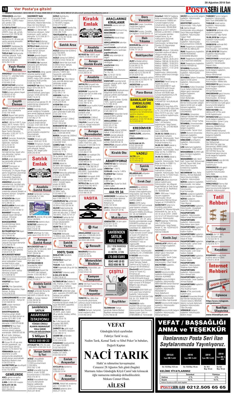 25 Ağustos 2018 Cumartesi Posta İstanbul Baskısı Seri İlana Sayfaları Posta İstanbul Baskısı 25.08.2018-1 Posta İstanbul Baskısı 25.08.2018-2