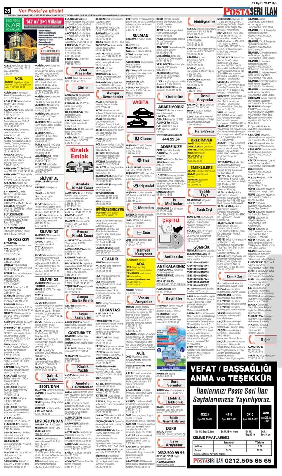 19 Eylül 2017 Salı Posta İstanbul Seri İlan Sayfaları