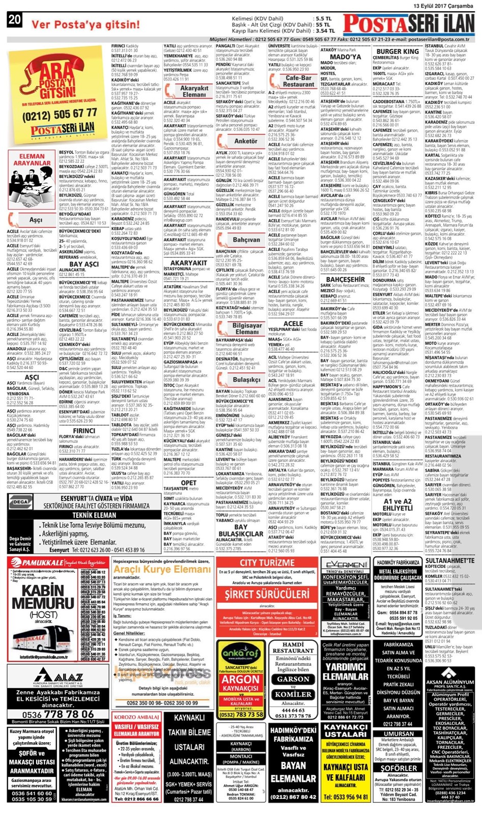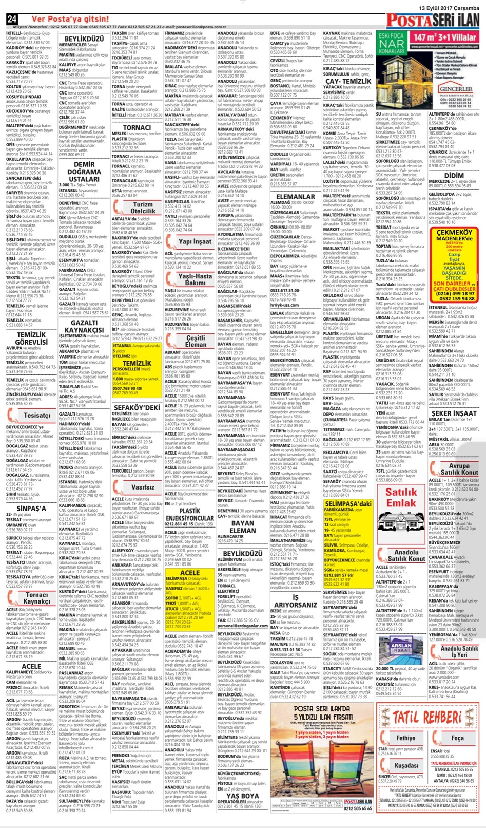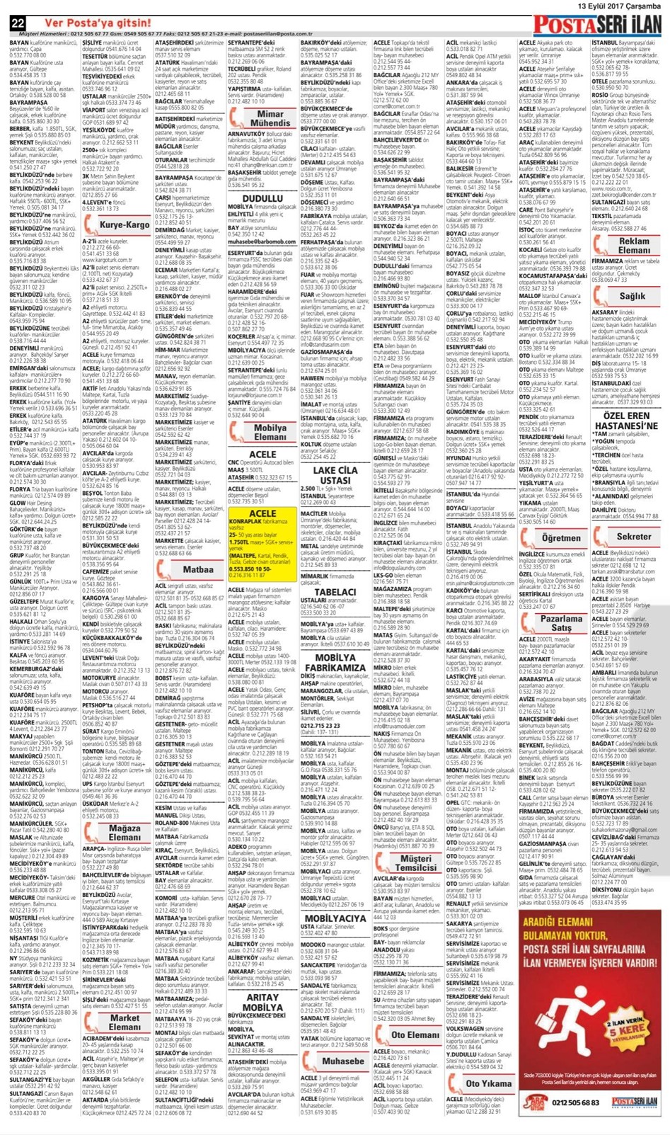 13 Eylül 2017 Çarşamba Posta İstanbul Seri İlan Sayfaları