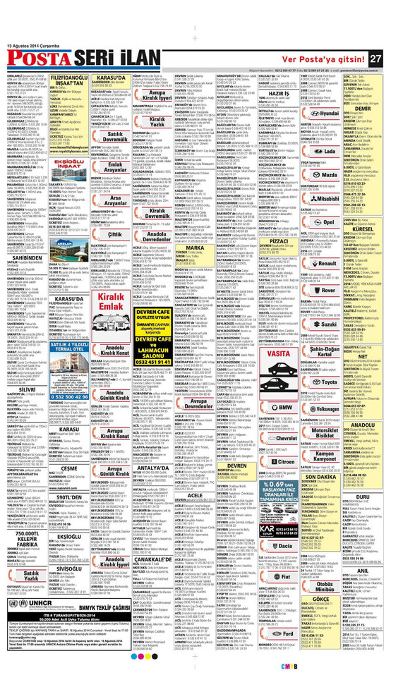- Anadolu Devredenler, Avrupa Devredenler Vasıta, Audi, Citroen, Fiat, Ford, Hyundai, Kia, Mazda, Mercedes, Opel, Renault, Rover, Şahin, Doğan, Kartal, Kamyon, Kamyonet, Otobüs Minibüs, Vasıta arayanlar, Kiralık Oto, Oto Gaz, Diğer Vasıta, İş Makinaları, Çeşitli, Antikacılar,Batilikler, Ders verenler, Estetik Güzellik Merkezi, Eşya Arayanlar,Evcil Hayvamlar, Nakliyeciler,