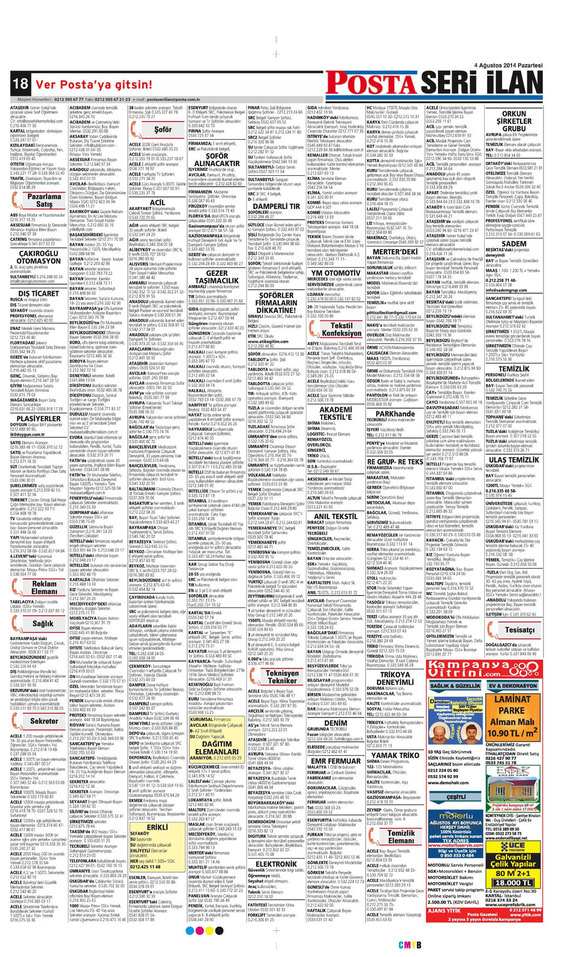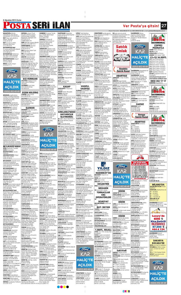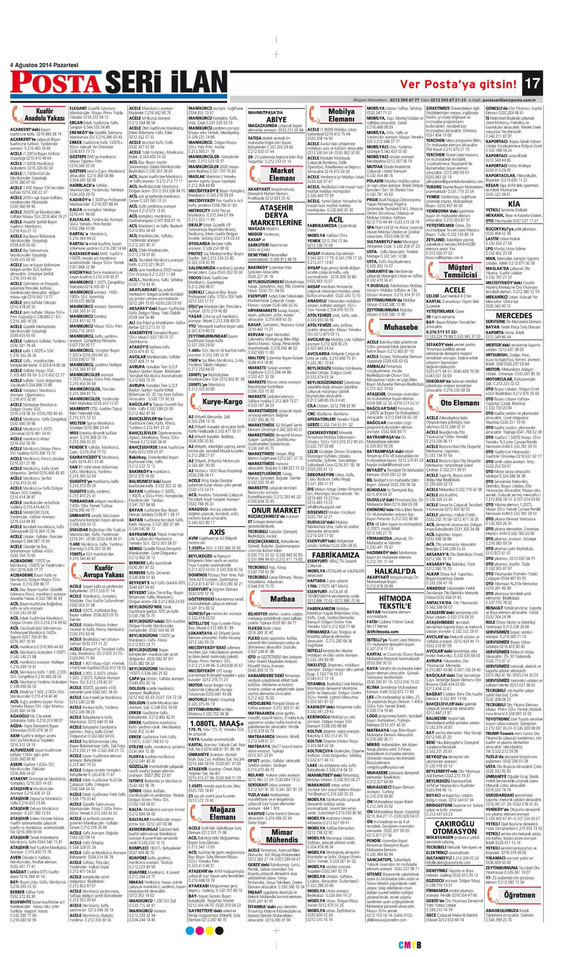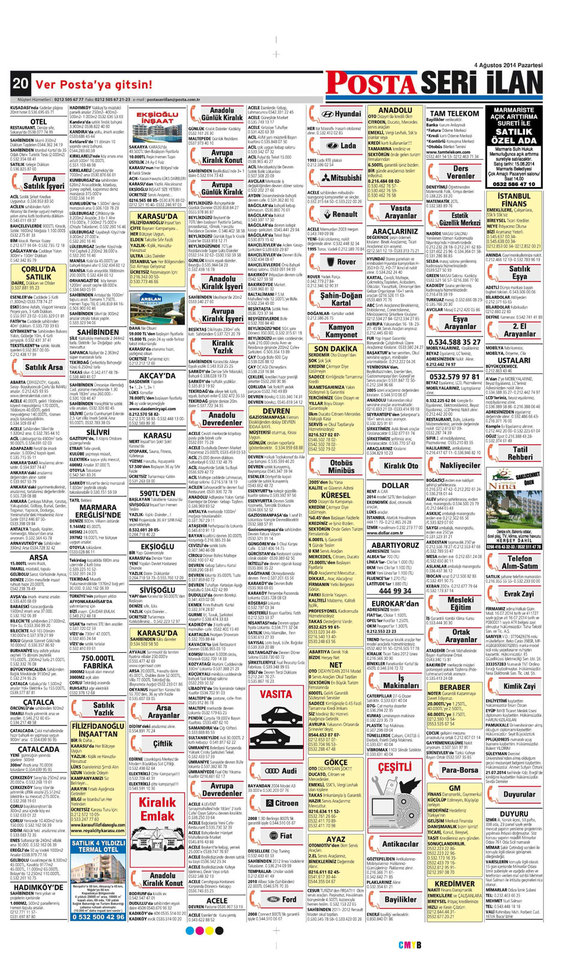 - Lada, Mitsubishi, Opel, Renault, Rover, Şahin, Doğan, Kartal, Kamyon, Kamyonet, Otobüs Minibüs, Vasıta arayanlar, Kiralık Oto, Oto Gaz, Diğer Vasıta, İş Makinaları, Çeşitli, Antikacılar,Batilikler, Ders verenler, Estetik Güzellik Merkezi, Eşya Arayanlar,Evcil Hayvamlar, Nakliyeciler,Mesleki Eğitim, Ortak arayanlar, Para Borsa, Satılık Eşya, 2.El Arayanlar, Tatil Rehberi, Tarım, Diğer, Duyurular, Evrak Zayi