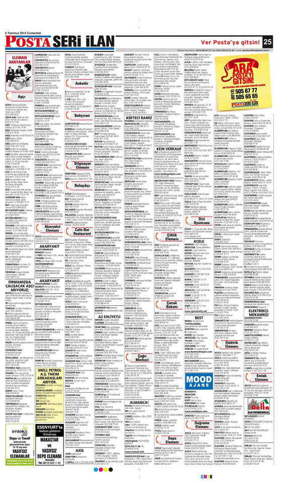 - Çerçeveli Eleman ilanları, Aşçı, Akaryakıt Elemanı, Anketör, Bahçıvan, Bilgisayarcı, Bulaşıkçı, Cafe Bar Restaurant, Çağrı Merkezi, Çiftlik Elemanı, Depocu, Dizi Oyuncusu,Elektrik Elektronik, Emlak Elemanı, Estetik Güzellik Elemanı,Ev İşlerine Yardımcı Garson,