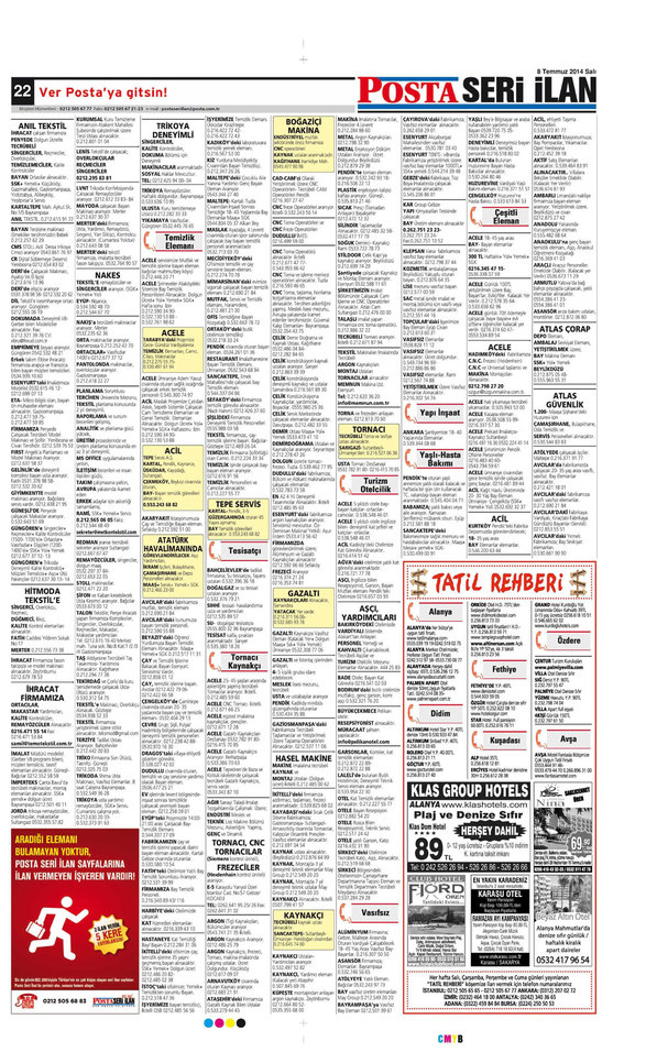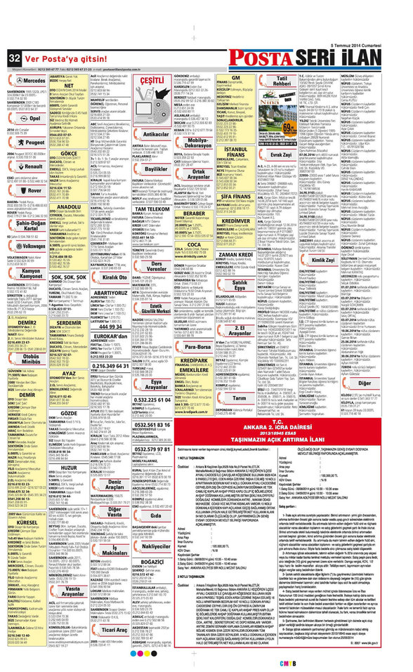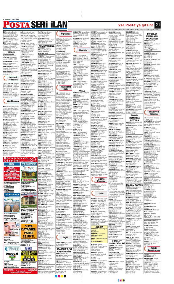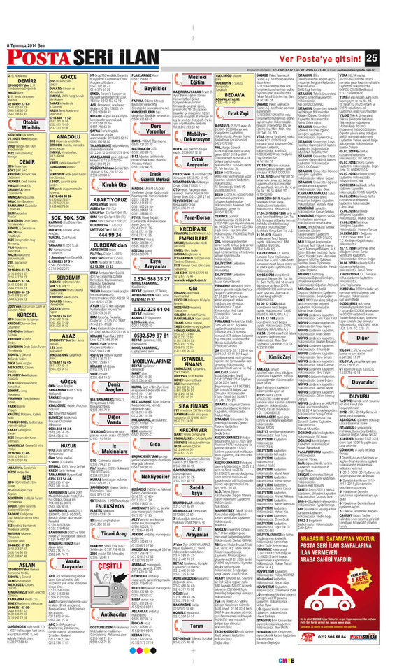 - Mercedes, Opel, Renault, Rover, Şahin, Doğan, Kartal, Kamyon, Kamyonet, Otobüs Minibüs, Vasıta arayanlar, Kiralık Oto, Oto Gaz, Diğer Vasıta, İş Makinaları, Çeşitli, Antikacılar,Batilikler, Ders verenler, Estetik Güzellik Merkezi, Eşya Arayanlar, Evcil Hayvamlar, Nakliyeciler,Mesleki Eğitim, Ortak arayanlar, Para Borsa, Satılık Eşya, 2.El Arayanlar, Tatil Rehberi, Tarım, Diğer, Duyurular, Evrak Zayi