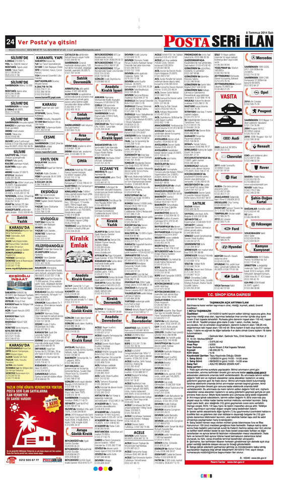 - Avrupa Günlük Kiralık, Avrupa Kiralık Konut, Anadolu Kiralık İşyeri, Avrupa Kiralık İşyeri, Kiralık Arsa, Kiralık Yazlık, Kiralık Devremülk, Anadolu Devredenler, Avrupa Devredenler Vasıta, Aodi, Citroen, Fiat, Ford, Hyundai, Kia, Mazda, Mercedes, Opel, Renault, Rover, Şahin, Doğan, Kartal, Kamyon, Kamyonet, Otobüs Minibüs, Vasıta arayanlar, Kiralık Oto, Oto Gaz, Diğer Vasıta, İş Makinaları, Çeşitli, Antikacılar, Bayilikler, Ders verenler, Estetik Güzellik Merkezi, Eşya Arayanlar,Evcil Hayvamlar, Nakliyeciler,Mesleki Eğitim, Ortak arayanlar, Para Borsa, Satılık Eşya, 2.El Arayanlar, Tatil Rehberi, Tarım, Diğer, Duyurular, Evrak Zayi,
