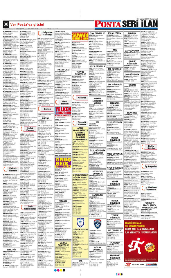 04.07.2014 Cuma Posta ilan sayfasında yayınlanan ilan başlıkları: Elektrik Elektronik, Emlak Elemanı, Estetik Güzellik Elemanı,Ev İşlerine Yardımcı Garson, Gemici, Grafiker, Güvenlikçi, İş Arayanlar, İş Makinası Operatörü, Kuaför Anadolu Yakası