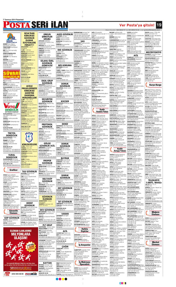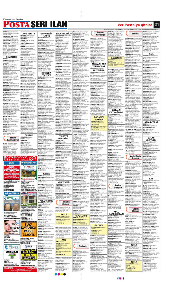 Tekstil Konfeksiyon, Temizlik Elemanı, Özel Mesaj, Tesisatçı, Tornacı Kaynakçı, Turizm Otel, Vasıfsız, Yapı İnşaat, Yaşlı Hasta Bakımı, Çeşitli Eleman, Kampanya Vitrini